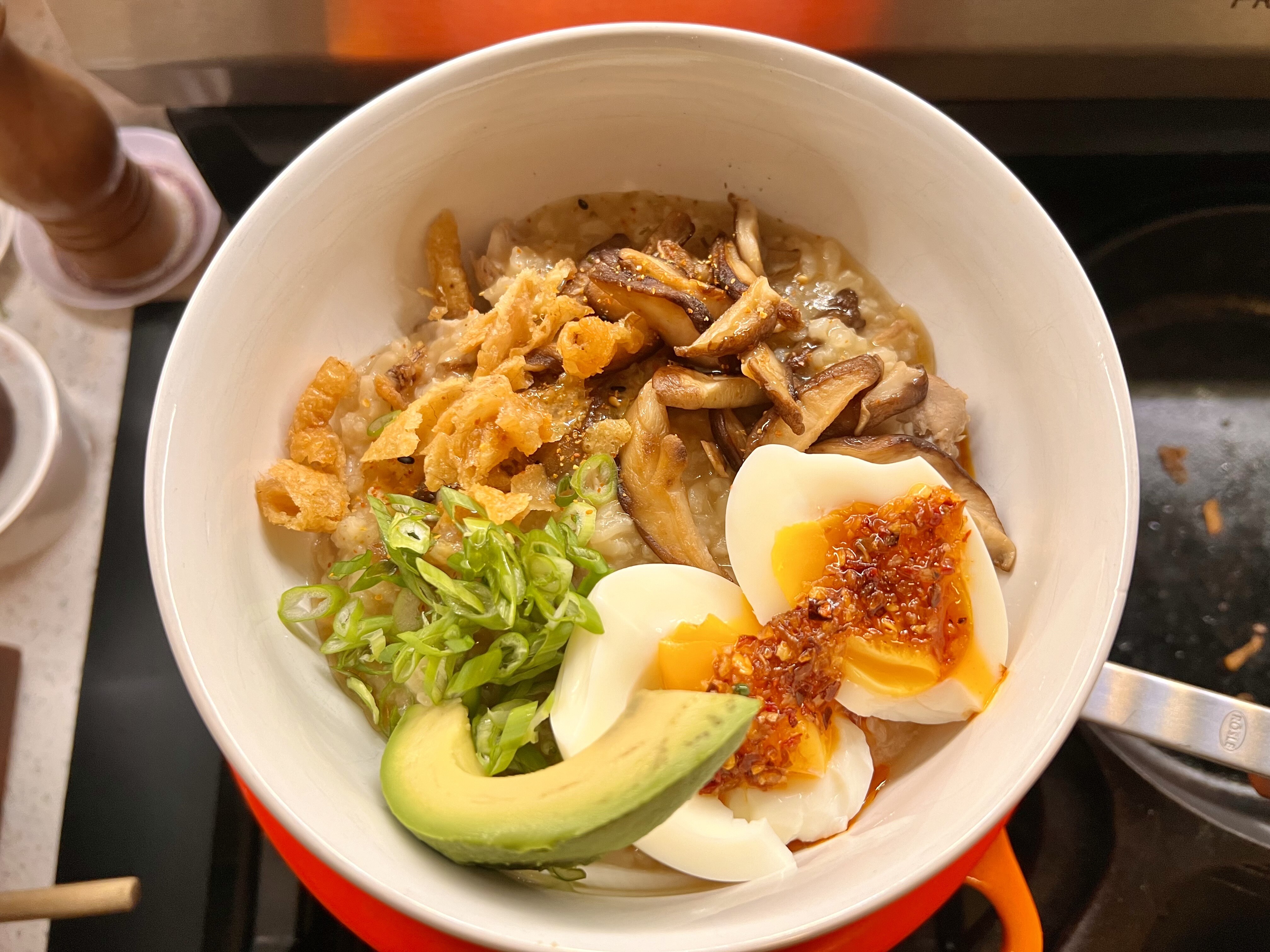 Conjee is my favorite style of the dish because I like the name and the savory rich flavors. I first made Conjee in culinary school and it stuck with me ever since. It’s a fun dish to use different styles and techniques as well as flavors, toppings, and textures! Overall it’s pretty bulletproof, hard to overcook, easy to adjust taste and consistency. All you really need is rice and a flavorful stock, everything else is there to dress it up.