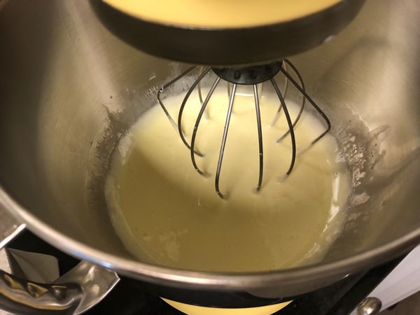 - While the mixture is heating, combine the egg yolks and sugar in the bowl of an electric mixer fitter with a whisk attachment. Whisk until the mixture is lightly thickened and then gradually ladle the milk mixture into the egg yolks. Do this slowly so as not to curdle the eggs.