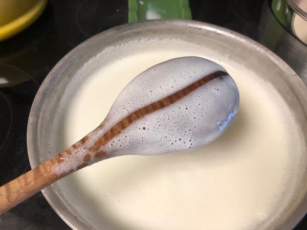 - Pour the mixture back into the saucepan and return to a medium low heat and stir and check the consistency by turning the spoon over and running your finger through the mixture that has coated the spoon. If the line from your finger remains clear, then the custard is ready.