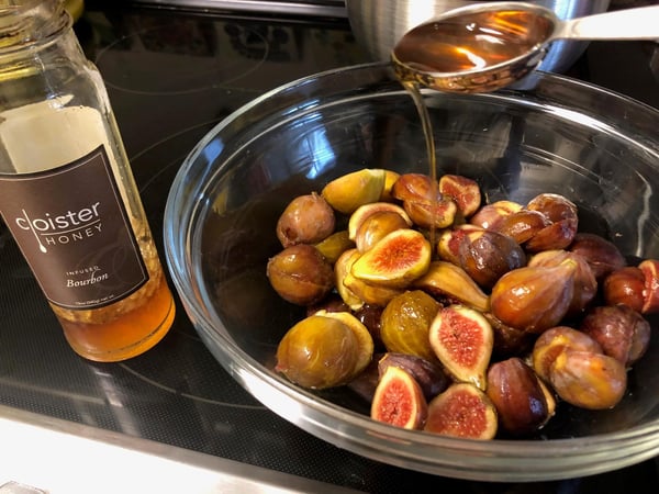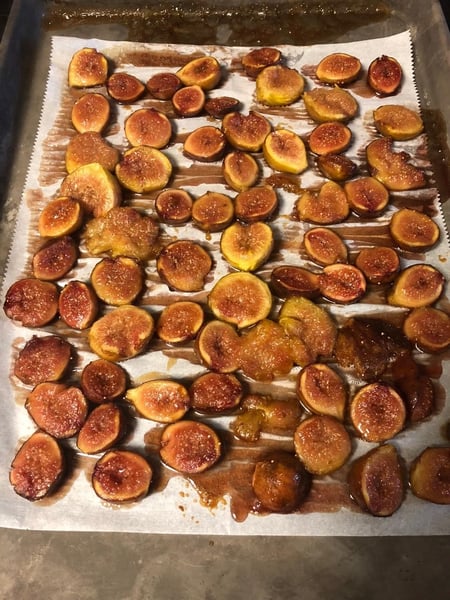 - Preheat the oven to 400 degrees and line a roasting pan with parchment paper. Combine the figs and honey in a bowl and then spread the mixture evenly over the roasting pan. Bake for 15 to 20 minutes or until caramelized and set aside to cool.