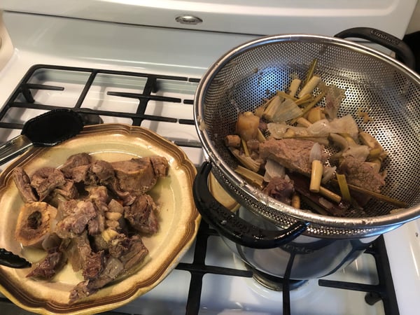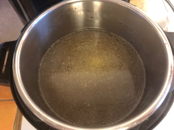6. Strain the broth through a fine strainer and return to the Instant Pot. Discard the remaining bones and aromatics. (At this point, the broth and beef can be cooled and refrigerated for up to 3 days.)