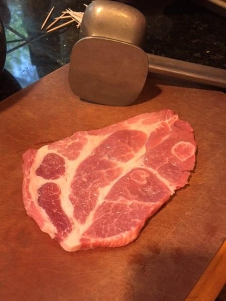 - Lay the thinly sliced and lightly pounded pork shoulder on your work surface, and season with salt and pepper to taste. Spoon about 2 tablespoons of the breadcrumb mixture onto each slice of the pork.