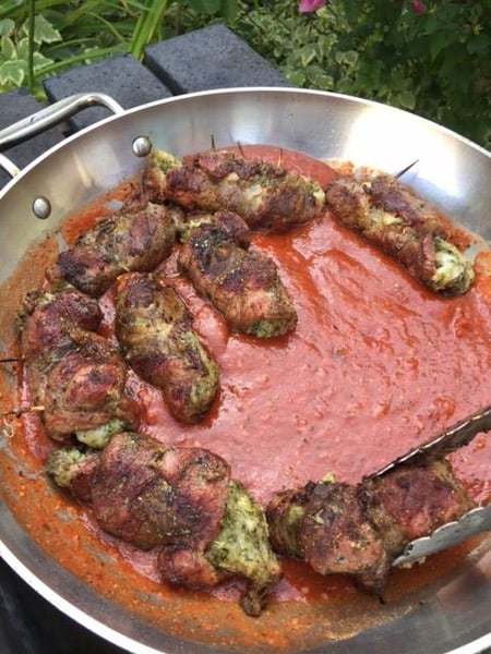 - Transfer the involtini to the cooler side of the grill, close the lid and gently cook until the pork is completely cooked through and tender, about 30 minutes, turning occasionally to ensure even cooking.