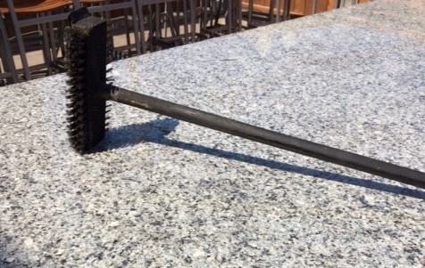 - Scrape any debris off of the cooking grates. A full day on the grill will leave behind a lot of charred debris. Multiply this by a full grilling season, and this debris really starts to become caked on. To remove this old, built up char, select the right tool for the job. If your grill is on the smaller side, you can use a standard one-handed grill brush with a scraper. On our outdoor grilling patio at The Chopping Block Lincoln Square, we use a two-handled grill brush for our larger grills. Scrape away any buildup on the cooking grates: the flat ‘burners’ that actually make contact with your food.