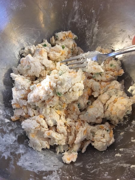 This is a standard biscuit-method recipe. I substituted heavy cream for the buttermilk, as I did not have any on hand. I also changed the flour mixture. Instead of only all-purpose flour, I used some cake flour blended with the AP flour. I also added jalapeños and cheddar cheese.