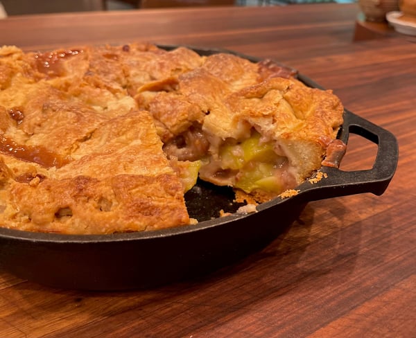 - Gently roll the dough onto the rolling pin, lift, and place into a 9- or 10-inch pie dish or seasoned cast iron skillet. Gently push the dough to fit the pie dish, allowing excess to hang over the edge.
