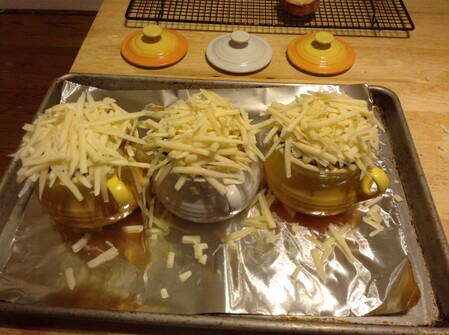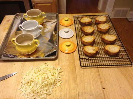 - Ladle the soup into ovenproof soup bowls, and set on a foil-lined sheet tray. Place two slices of bread on top of the soup, and generously cover with the grated cheese.