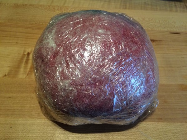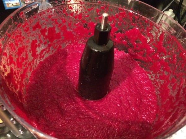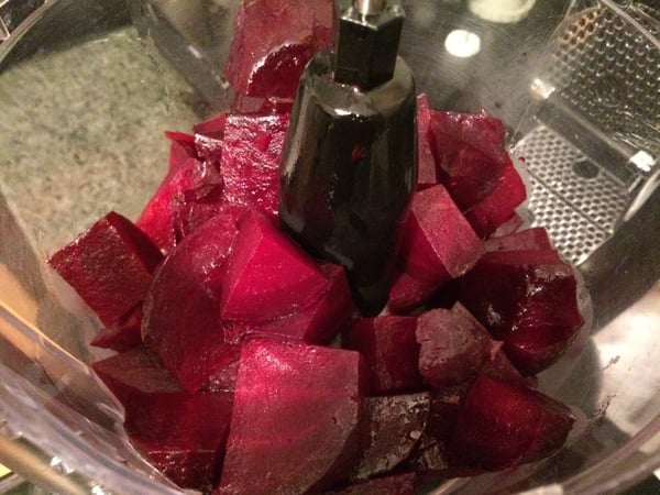 Now it’s time to prepare the pasta dough! Peel the beet. I would HIGHLY encourage you to wear a pair of disposable gloves when working with the beets, otherwise, you will find yourself with some heavily stained hands. Likewise, if you have lighter countertops, line them with wax paper as you work with the beets, so they don’t stain the countertops. Once the beets are peeled, cut them into large chunks and place in a food processor.