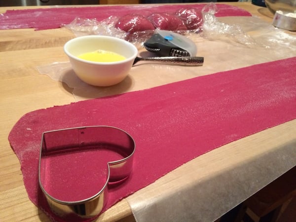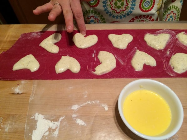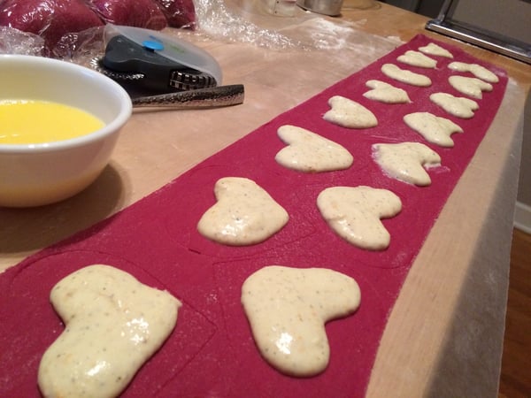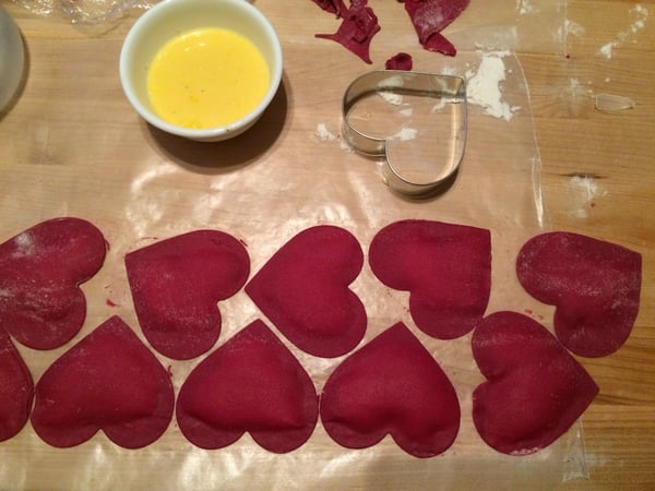 To add an extra romantic element to the ravioli, I opted to make them heart-shaped using a cookie cutter. You can go this route, or do the more traditional round or square-shaped ravioli instead, if you like.