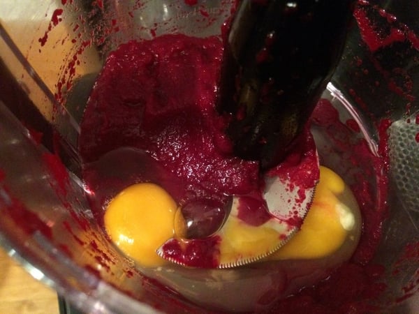 Measure the beet puree, leaving only ½ cup in the food processor. The rest can be discarded or used in another recipe. Add the eggs to the food processor and puree again.