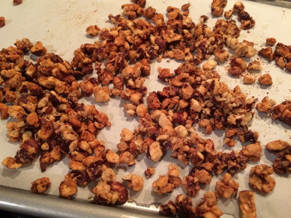 As the beets are cooling, prepare the hazelnut garnish. Line a quarter sheet tray with parchment paper. In a small bowl, mix together the chopped hazelnuts and honey. Spread the hazelnuts on the sheet tray and sprinkle with the salt. Bake for 8-9 minutes, stirring occasionally. Allow the nuts to cool so the honey glaze can further harden.