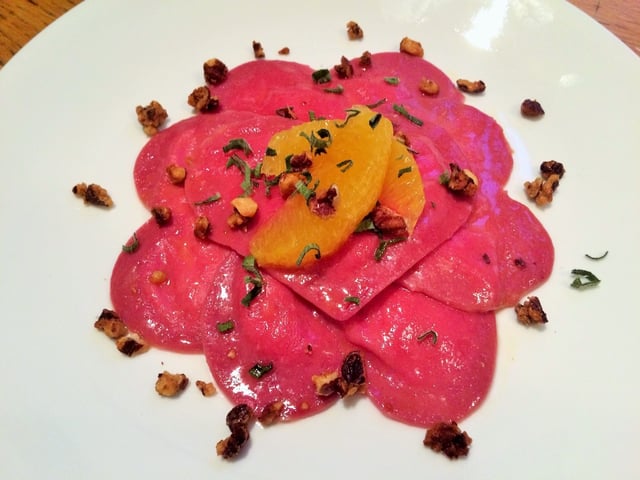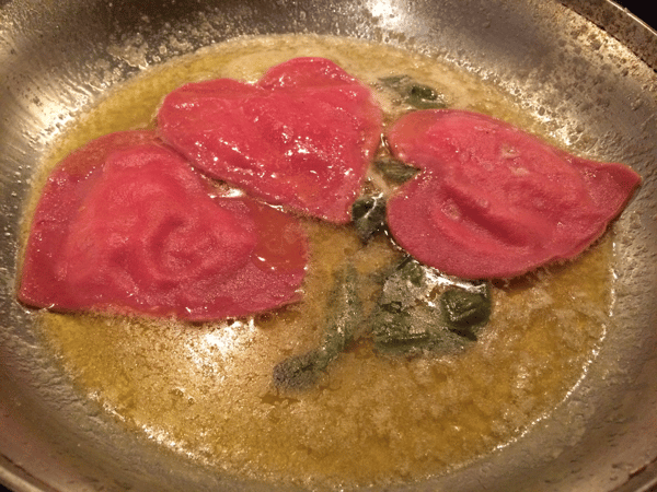 3-Cheese Beet Ravioli in a Brown Butter Sage Sauce with Salted Honey Hazelnuts