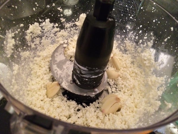While the dough rests, prepare the filling. Now is a good time to give the food processor a clean, so it doesn’t stain. Remove the paper from the garlic and add the whole cloves into the freshly cleaned food processor; turn it on to chop it down. Next add the goat cheese to break it down.