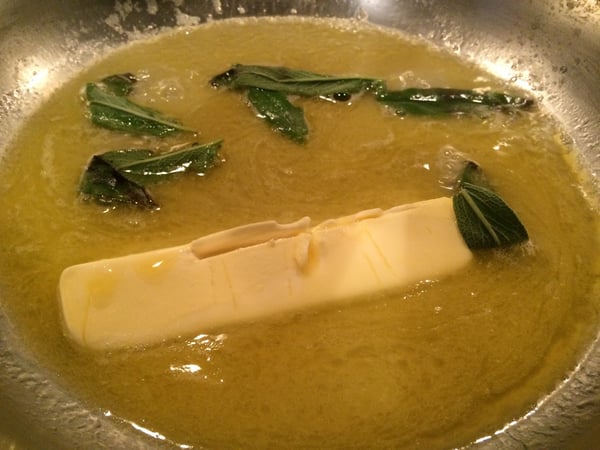 Using a spider, scoop the ravioli from the boiling water, draining off as much excess water as possible. In batches, toss the ravioli in the sage butter, then transfer to a plate.