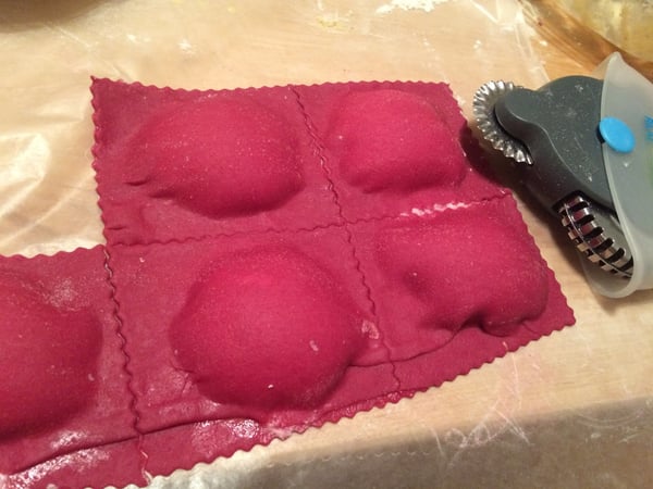 Once the full sheet has been cut, transfer the ravioli to a floured sheet tray, pinching around the edges of each ravioli one last time to make sure it is fully sealed. You could also use a fork to do this if you would like added texture to your ravioli. Set aside as you form the rest of your ravioli with the other sheets of pasta.