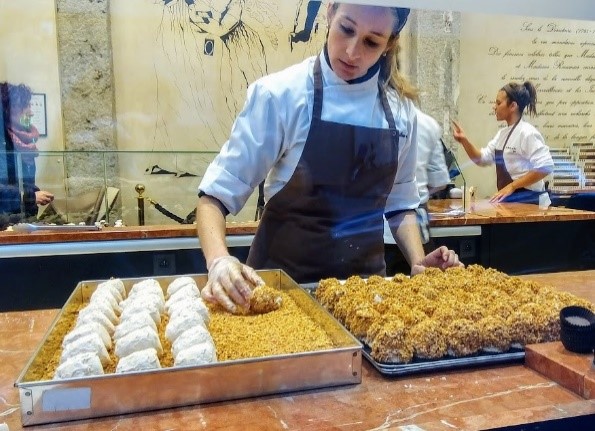 Our first stop was the Presqu’île, the heart of Lyon that extends from the foot of the Croix Rousse hill to the confluence of the Rhône and the Saône rivers. In the middle of the peninsula, long tree-lined pedestrian streets Rue de la République and Rue du Président Édouard Herriot are dotted with charming boutique shops selling clothing, fashion accessories, home furnishings and of course, food. On every street, you’ll find chefs preparing delicious treats made fresh like praline whipped cream meringue coated with almond chips and caramelized hazelnuts at Aux Merveilleux de Fred.