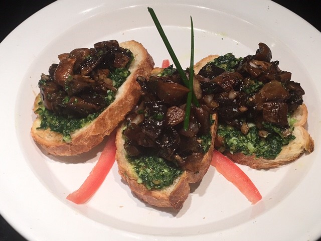 To make bruschetta, slice a baguette into 1/4" thick rounds and either toast in an oven until slightly browned or mark them on a grill to toast them. Brush some pesto on the crostini and top with the mushroom mixture and serve!