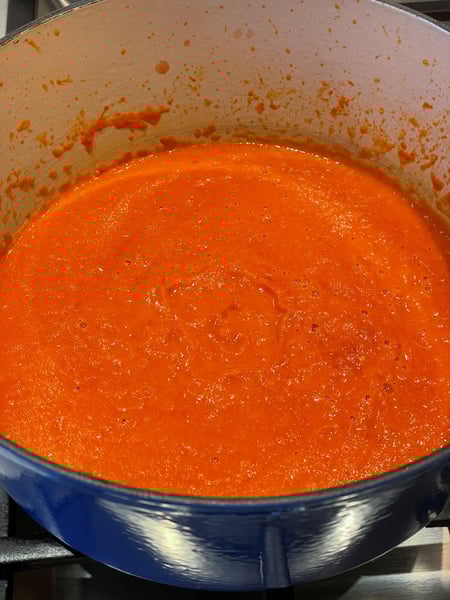 3. Once the tomatoes begin to soften, mash any large pieces with the back of a spoon. The sauce is done when the butter has separated from the tomatoes and there is no longer any liquid remaining.