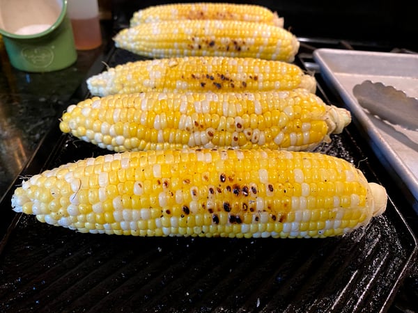 - Grill the corn, turning as needed, until golden brown and caramelized on all sides. Set aside to cool.