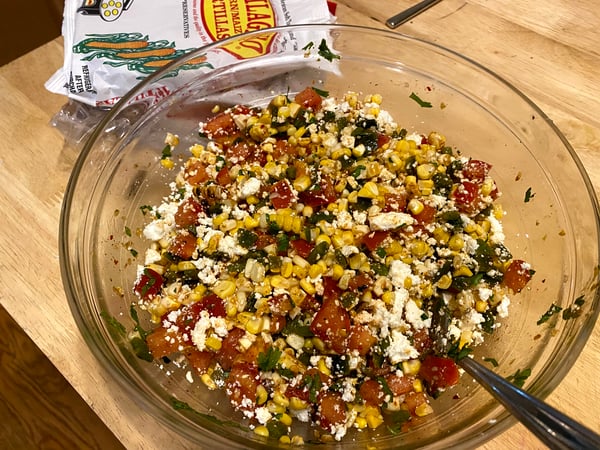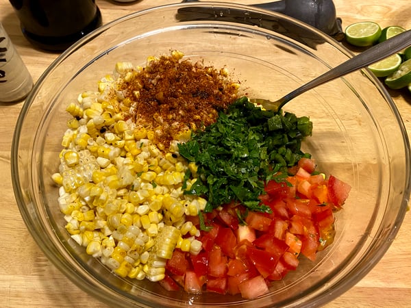 To the corn and peppers, I added a dice of ripe tomato, lime juice to taste, cilantro, a splash of olive oil, a very generous shake of Tajín (it contains salt, so taste the salad first before you add additional salt), and I finished with a crumble of queso fresco.