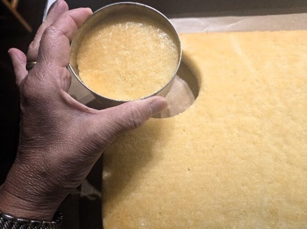 - Using a biscuit cutter or round glass about 3” in diameter, cut 6 rounds from the cake, saving the scraps for another use.
