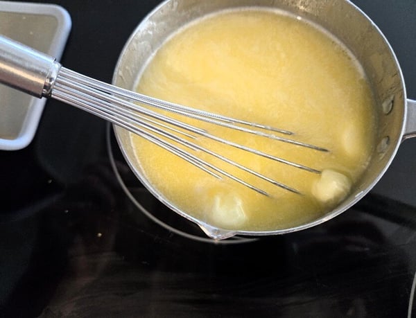 Next, gently melt 2 sticks/16 Tablespoons butter in a small saucepan over low heat. Alternatively, you can put the butter in a microwave-safe measuring cup and melt it in the microwave. I realize that I dirtied an extra pan by melting it on my stovetop and then transferring it into a measuring cup for pouring later but, for me, I can keep a better eye on it when it’s right in front of me. I like to let the butter melt to where there are a few small pieces left, then turn off the heat and stir/whisk them until they melt completely. This keeps the butter from getting too hot.