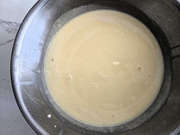 Repeat this sifting and whisking two more times, scraping down the sides with the final blending. Your final batter will resemble pancake batter. It will be very fluid, but have a thickness to it.