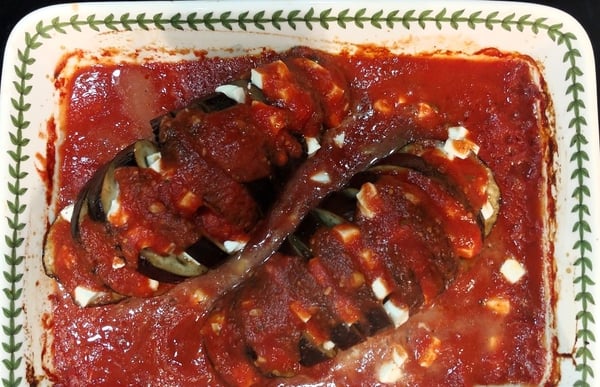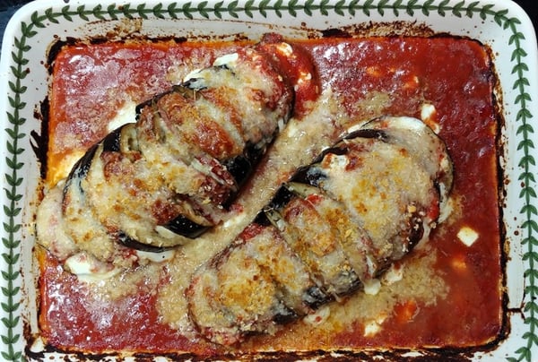 - Spoon some of the tomato sauce from the baking dish over the tops of the mozzarella-stuffed eggplants. Smooth remaining sauce evenly across the bottom of the baking dish.