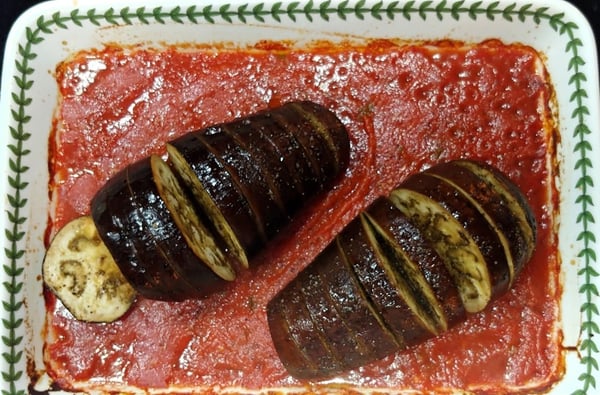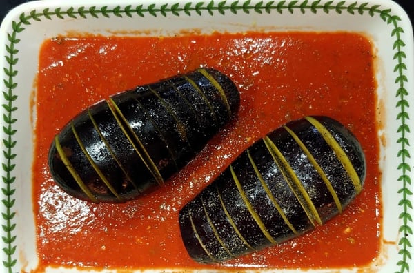 - Place the slit eggplants on top of the sauce in your baking dish. Using your fingers to gently spread each piece of eggplant apart, brush olive oil on both sides of each piece. Season each inside each slit with a bit of salt and pepper.