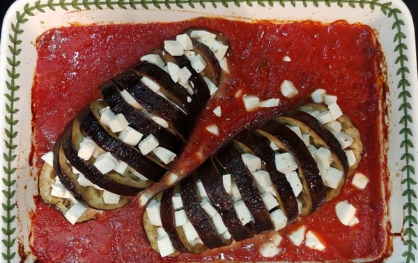 - Using a spatula to hold back each of the hot eggplant slices, place mozzarella into each slit. My preference for using cubed mozzarella instead of shredded is because I like the way the mozzarella seems to “pool” more as it melts when cubed – but this is purely personal preference. Note that if a bit of mozzarella – cubed or shredded - escapes the eggplant, it’s not the end of the world!