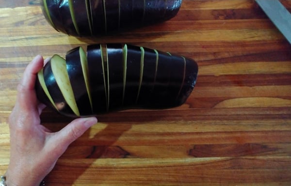 - Make deep slits cross-wise in each eggplant, about 1/2” apart. Do not slice all the way through the eggplant. The slits should stop about 1/2” from the bottom of the eggplant.