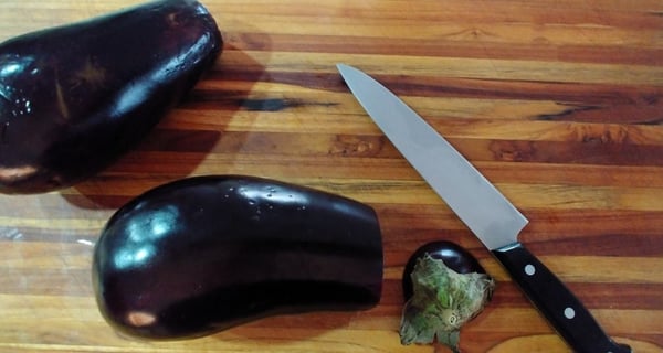 - Trim the tops off the eggplants, just below the stem at the top. Discard the tops.