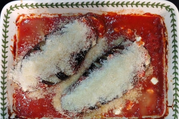 - Scoop the Parmigiano-Reggiano/parmesan on top of the eggplants and finish off with a sprinkling of panko.