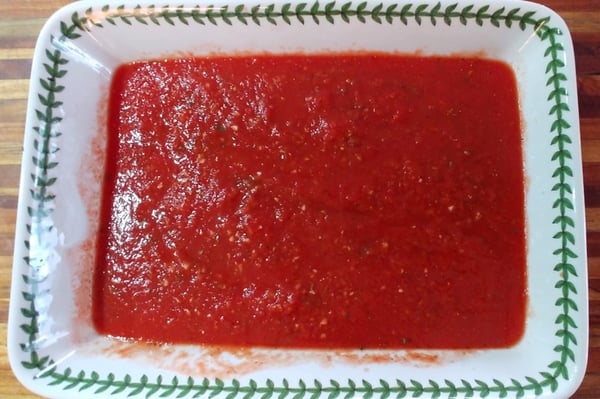 - Using a 13”x9” baking dish, stir together the crushed tomatoes, garlic, and dried oregano directly in the bottom of the dish. Lightly season with salt & pepper, keeping in mind that you will also be seasoning the eggplant. Set aside.