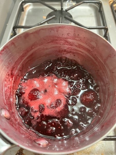 - Cook down stirring occasionally until water has evaporated and you are left with a thick syrupy sauce with soft berries.