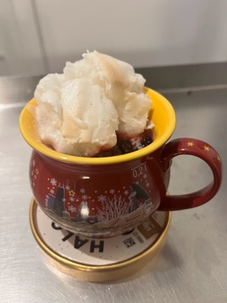 - Place a scoop of vanilla ice cream in a mug or bowl.