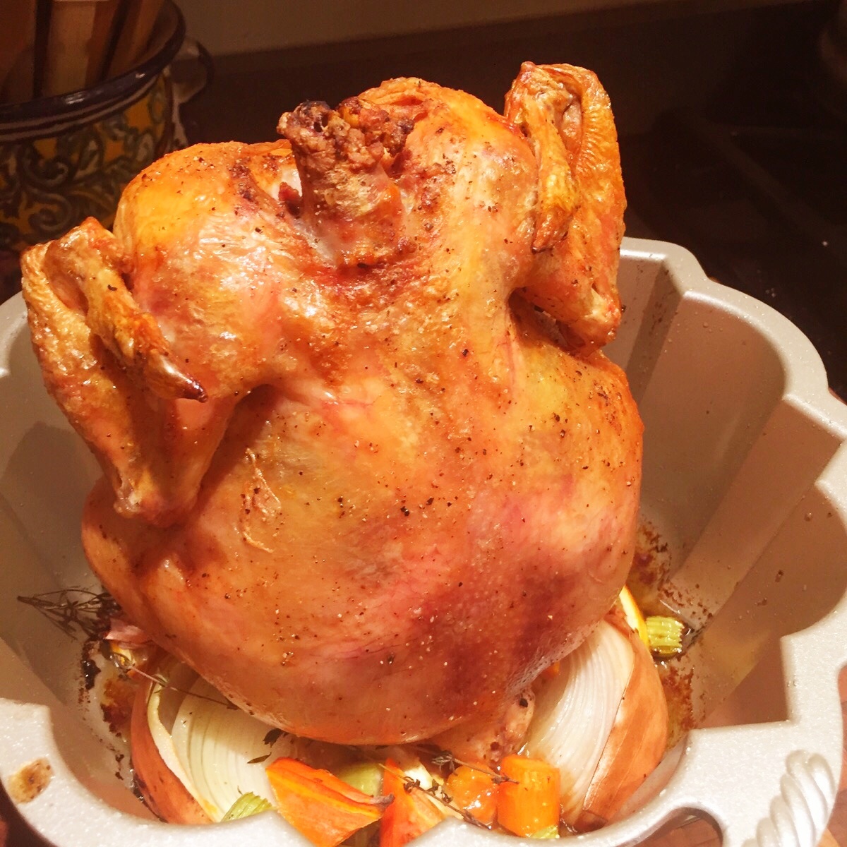 It seems this obsession also applies to my former coworker and good friend, Bailey Phillips. One day while on Facebook, I noticed Bailey had posted a photo of a whole chicken she was about to roast in the oven. After, she posted a picture of the final result. It was beautiful and accomplished in a Bundt pan! The photo showed a beautifully, golden brown roast chicken and with what seemed to be extremely crispy skin. After seeing that, I was off to the store to purchase everything I needed to attempt to replicate Bailey’s perfectly roasted chicken. I started by buying a really nice, organic, free-range air-dried roasting chicken. I also got several aromatics, such as onions, celery, carrots, herbs and lemons that would help create lots of flavor while the chicken roasted. I also bought ingredients for a couple of side dishes that would go great with roast chicken; creamy buttermilk mashed potatoes and brown sugar charred honey glazed carrots.
