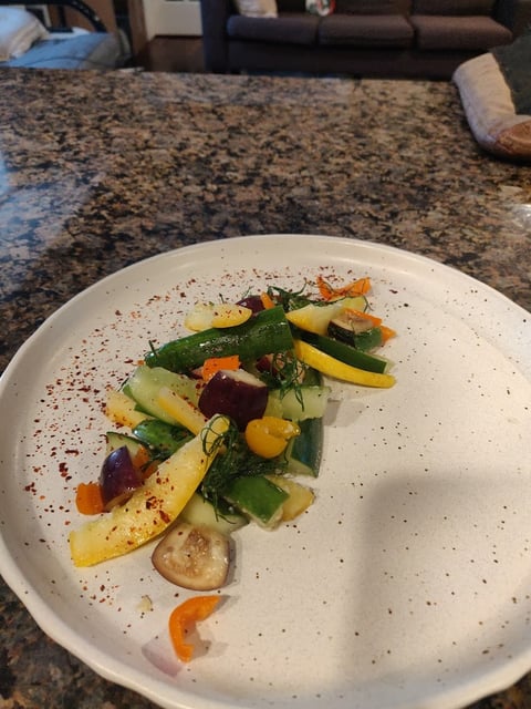 Place the vegetables and the Koji water mixture in a Ziploc bag or plastic container. Mix well until all the vegetables are coated and then allow to sit at room temp for one hour to one day before refrigerating. The thicker the vegetable, the longer it will take. You can also add in spices or other flavorings such as chili flakes, paprika, or even mustard powder at this point to change the end result.
