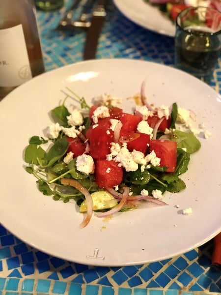 I got my inspiration for the salad from one of my favorite Mexican restaurants, Kie-Gol-Lanee. They specialize in authentic dishes from the region of Oaxaca in Mexico. I’ve done several versions of watermelon salad, with some having far too many ingredients. But after having dinner a few times this summer at Kie-Gol-Lanee and having theirs, I just knew that I had to create a similar version of it. The ingredients for the salad consisted of a mound of watercress, thinly sliced red onion, thinly sliced English cucumbers, dressed in a simple red wine and lemon vinaigrette, topped with cubes of watermelon, crumbled feta cheese, a drizzle of extra virgin olive oil, cracked ground black pepper and served on chilled salad plates. It was the perfect salad for eating outside on a warm summer night.