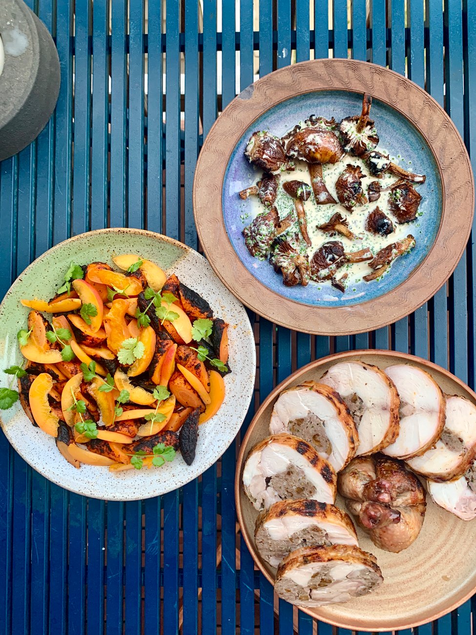 I finished the chicken over high heat on the grill, then while it was resting, I cut the carrots, and plated them with fresh cut cilantro and slices of apricot. I also made a creamy sauce for the mushrooms with buttermilk, freshly cut chives, and rosemary. When I had finished plating those the chicken was done resting so I sliced it and plated it as well.