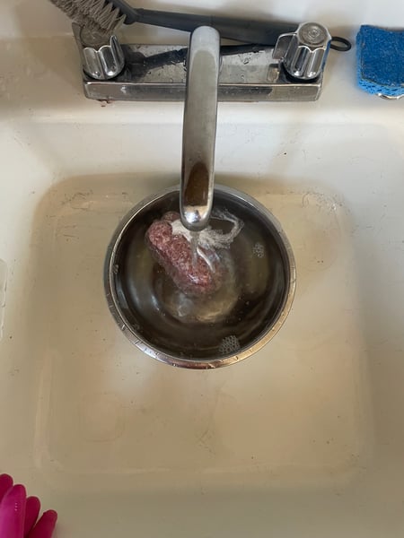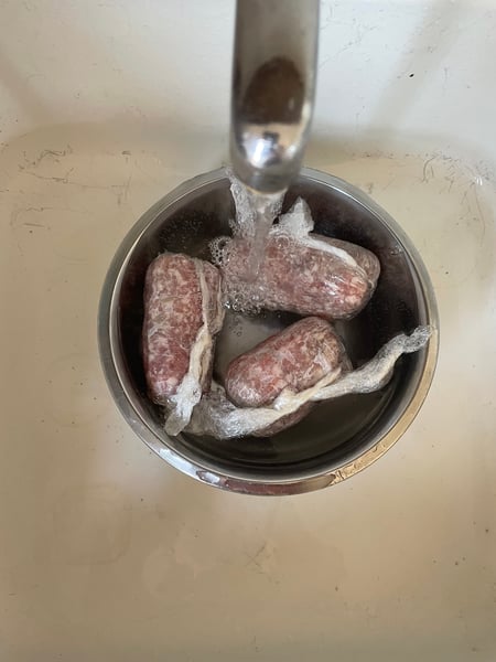 At this point the butter needs to chill a little to become workable, so I also grabbed some ground pork out of the freezer to thaw (I’m thawing it under cold running water because I don’t think ahead and need it on the quick) because I want to turn it into breakfast sausage to make sausage rolls with some of my croissant dough.