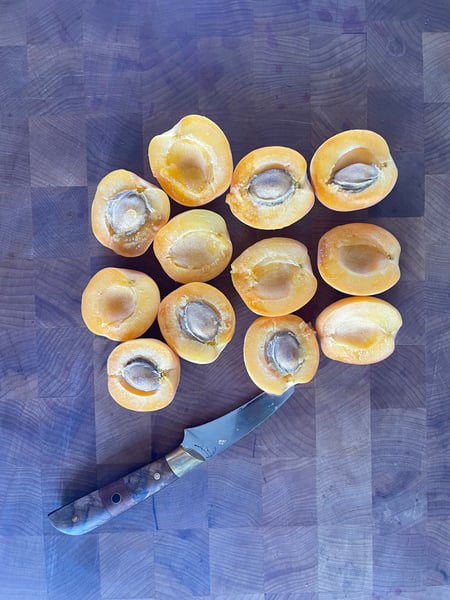 I wanted to use some of this special fruit right away so I decided to split my croissant dough between sausage rolls and apricot danishes. I cut a bunch of the ripest fruits in half.