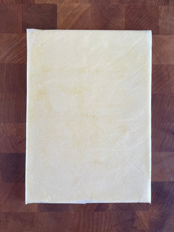 The first thing I did was get myself a glass of water. Then I got my butter out of the fridge to soften. For all viennoiserie it's best to use a butter with a high percentage of butter fat. Typically these butters will be labelled “European style” or something similar and will clock in at around 84% butter fat. I'm using a salted butter from Farmhouse Kitchen, a coop based in Wisconsin.