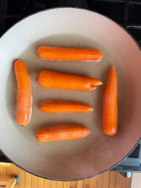 Since the chicken was ready to start cooking I also wanted to start the sides. To wit, I peeled the carrots, cooked them in chicken stock, and grilled the mushrooms along with the wrapped up chicken.
