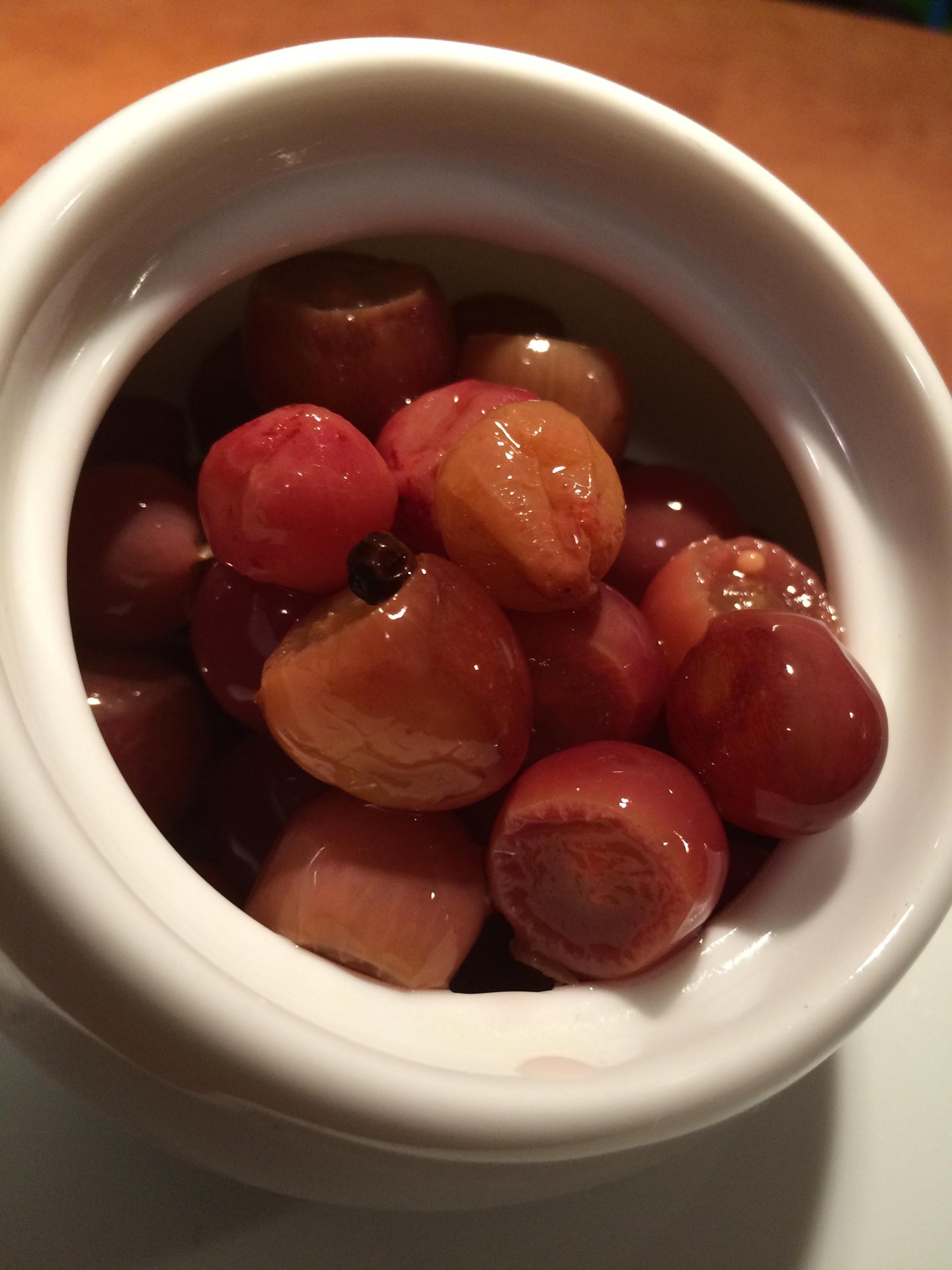 To start, cut a small slice off the top of each grape to expose the flesh inside. This will allow the brine to diffuse into the grape more effectively. Next place the spices in the bottom of a non-reactive container and combine the vinegar, salt, and sugar in a small saucepan.