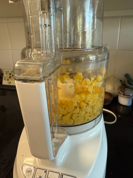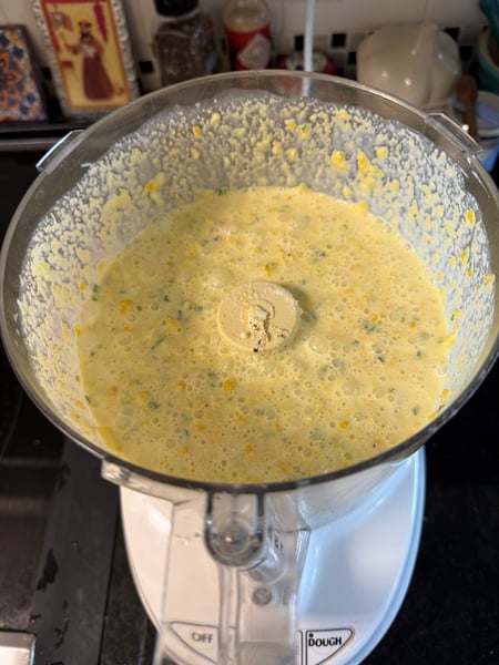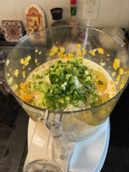 6. Add cream, cornmeal, scallions, Parmesan cheese, eggs and salt and pepper. Pulse until just combined.