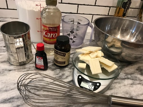 The fillings were comprised of Elderflower Simple Syrup, Lemon Curd and Vanilla Buttercream. I continued on with Follow the Ruels’ Elderflower Simple Syrup and Lemon Curd and Swiss Buttercream Recipes. These were really easy. The Simple Syrup came together while I made the Lemon Curd. I set both aside to cool and moved on to the Swiss Buttercream.