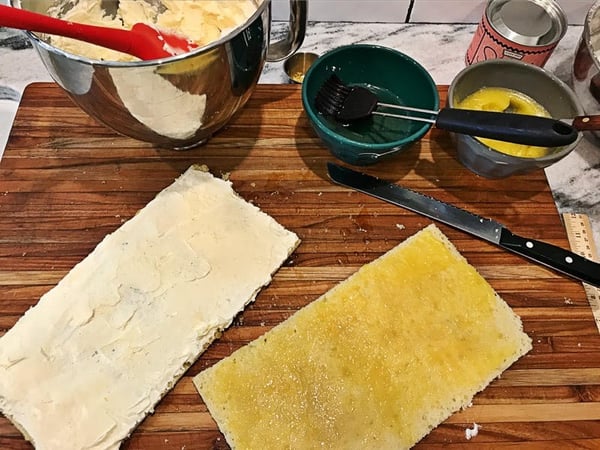 The cake batter was spread out on a half sheet tray and baked at 350 for about 20 minutes. The cake came out pale and even which is just what you want for Petit Fours.