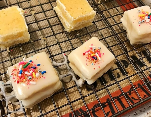 The Petit Fours were finished with a coating of icing and a dash of sparkly sprinkles.