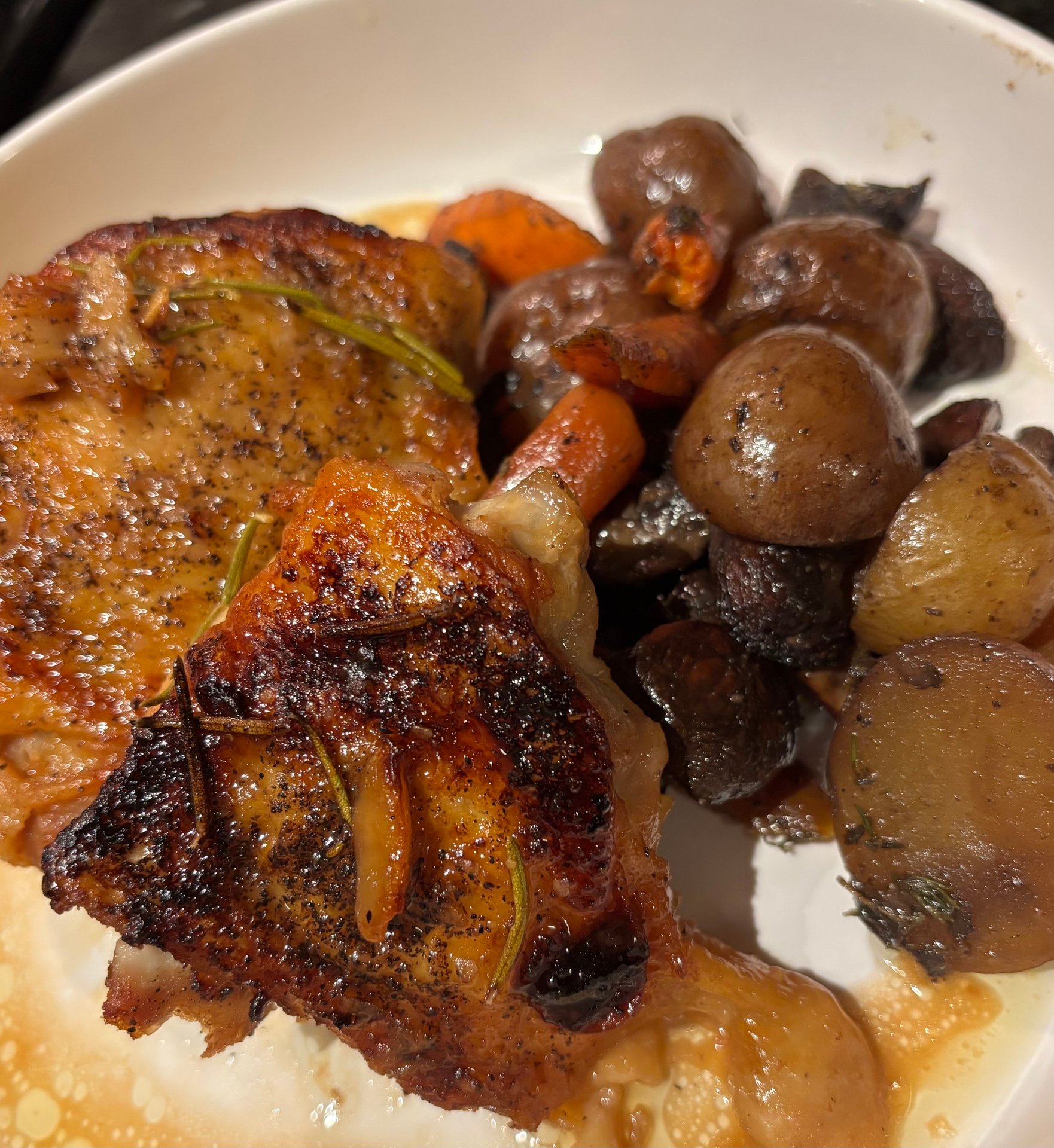 For a side dish, I tossed some sliced carrots, baby potatoes, and mushrooms in olive oil, thyme, salt and pepper, and roasted them in the oven at 400°F for about 45 minutes. The glaze acted as a perfect dressing to the veggies, and I ended up with a full meal without doing too much extra work. If you want to copy this side dish, I recommend either roasting the mushrooms separately, or adding them to the pan in the last 15 minutes or so, so they don’t overcook.